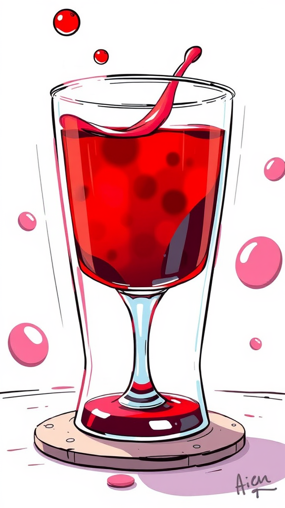 A vibrant, colorful 3D cartoon sketch of a glass filled with a mysterious red liquid, exuding an anime-inspired style with playful, exaggerated features. The scene is rendered in a low-resolution, normal quality, giving it a charmingly unrefined look, while maintaining a sense of intrigue and wonder.