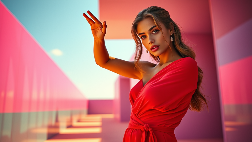 A vibrant commercial photo featuring a stunning Instagram fashion model in a crimson wrap dress, striking a captivating pose. The scene exudes the essence of vivid geometrics in the style of Guy Aroch and Helene Knoop, with the Unreal Engine 5's influence. The setting is bathed in glowing pastels, enhanced by bold lines and bright, sun-soaked hues. Captured with a Fujifilm X-T4 and a Sony FE 85mm lens, the image embraces a raw, artistic style, showcasing the intricate play of light and color against a 9:16 aspect ratio.