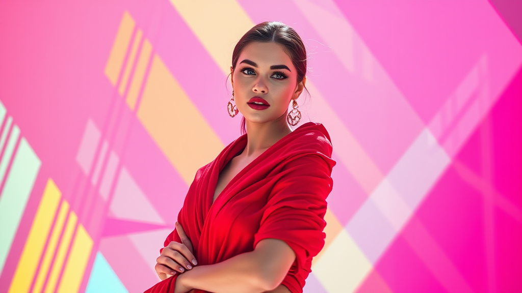 A vibrant commercial photo featuring a stunning Instagram fashion model in a striking red wrap, posed with elegance. The scene is infused with colorful geometric patterns, inspired by the bold aesthetics of Guy Aroch and Helene Knoop. The image radiates with glowing pastels and bold lines, utilizing bright, sun-soaked colors that highlight the model's allure. Captured with the clarity and depth of a Fujifilm X-T4 and the precision of a Sony FE 85mm lens, this shot is a raw expression of style and creativity, enveloped in a dreamlike atmosphere enhanced by unreal engine technology.