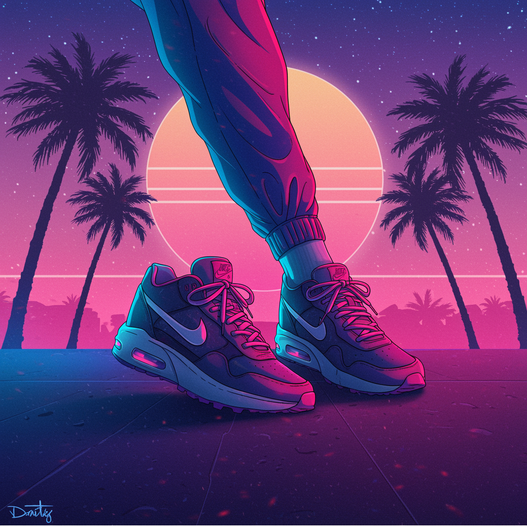 A vibrant concept art piece featuring a pair of sleek sneakers set against a backdrop of swaying palm trees, infused with the stylistic elegance of Dmitry Levitzky's portraiture. Inspired by the ethereal and futuristic vibe of Grimes' Book 1 album cover, the scene is alive with art deco and outrun anime aesthetics, reminiscent of the bold, dynamic imagery seen in Juxtapoz Magazine. The sneakers, akin to Nike Air Max design, exude a sense of modernity and motion, seamlessly blending into the colorful, neon-lit ambiance of the artwork.