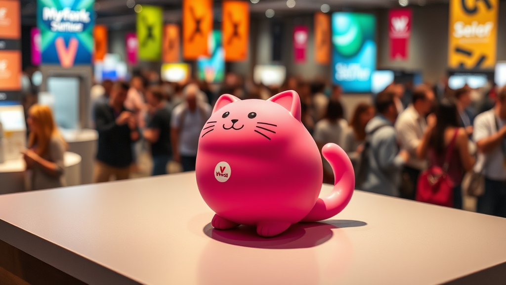 A vibrant conference scene showcasing a pink cat-shaped stress ball, adorned with the brand logo, resting on a sleek merchandise display table. Soft lighting highlights the playful yet functional design of the stress ball, inviting attendees to engage with it. The bustling background features colorful banners and excited participants milling around, creating a lively and dynamic atmosphere.