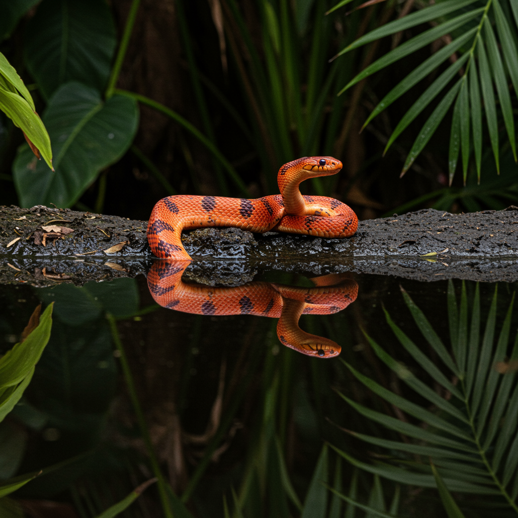 A vibrant coral snake gracefully glides through the scene, its striking colors vividly contrasting against the lush backdrop of tropical foliage. Half submerged, the snake's head is split by the waterline, showcasing its curious gaze both above and below the surface. The water acts as a perfect mirror, creating a realistic and seamless reflection. Captured with a Panasonic DC-S5 using a 28-70mm F2.8 DG DN lens, the image is taken at ƒ/8.0, with a focal length of 70mm, 1/80 shutter speed, and an ISO of 800, all without the use of artificial lighting, allowing the natural light to illuminate the scene beautifully. A slight breeze causes gentle ripples, adding a dynamic element to the stillness of the reflection.