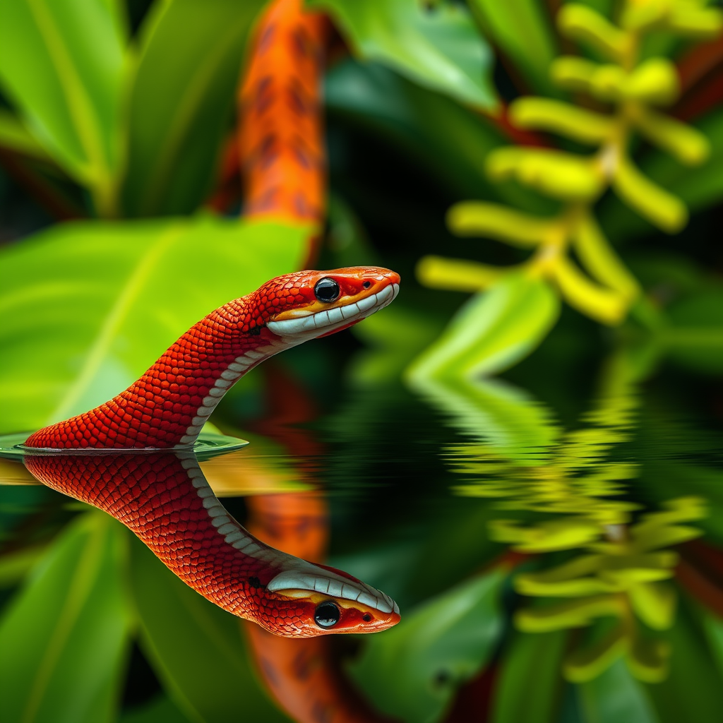 A vibrant coral snake is poised elegantly with its sleek body set against a backdrop of lush tropical foliage, its sinuous form weaving between rich green leaves. The scene captures the snake with half of its head submerged in the serene, mirror-like water, creating a breathtaking and realistic reflection that blurs the line between reality and its mirrored counterpart. Photographed with a Panasonic DC-S5 using the 28-70mm F2.8 DG DN Contemporary 021 lens, the image captures the intricacy of the snake's scales and the subtleties of the natural light at ƒ/8.0 with a focal length of 70mm and a shutter speed of 1/80, ISO set at 800, with flash turned off, allowing the pure ambiance of the environment to illuminate the moment.