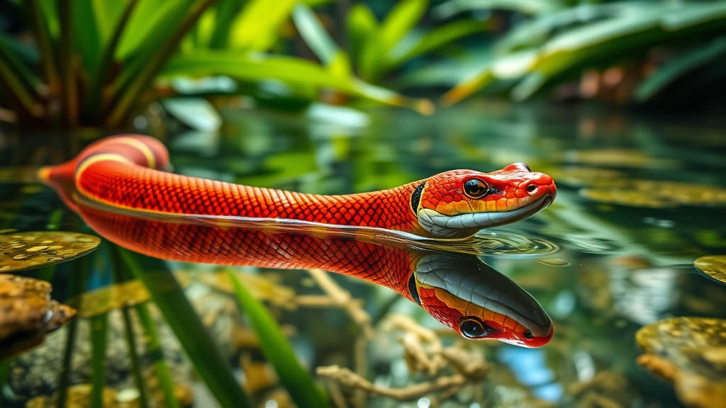A vibrant coral snake partially submerged in crystal-clear water surrounded by lush tropical plants, the scene captures the intricate patterns of its scales with a stunningly realistic reflection in the shimmering surface. Shot with a Panasonic DC-S5 using a 28-70mm lens at f/8.0, 70mm, 1/80 sec, and ISO 800, the natural lighting enhances the vivid colors of the snake and foliage, despite the absence of flash, creating an immersive and tranquil jungle atmosphere.