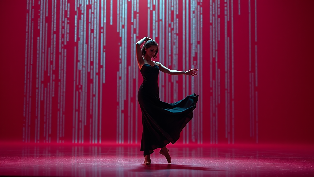 A vibrant crimson square showcasing a pixelated dancer poised gracefully, clad in elegant ebony attire against a digital backdrop.