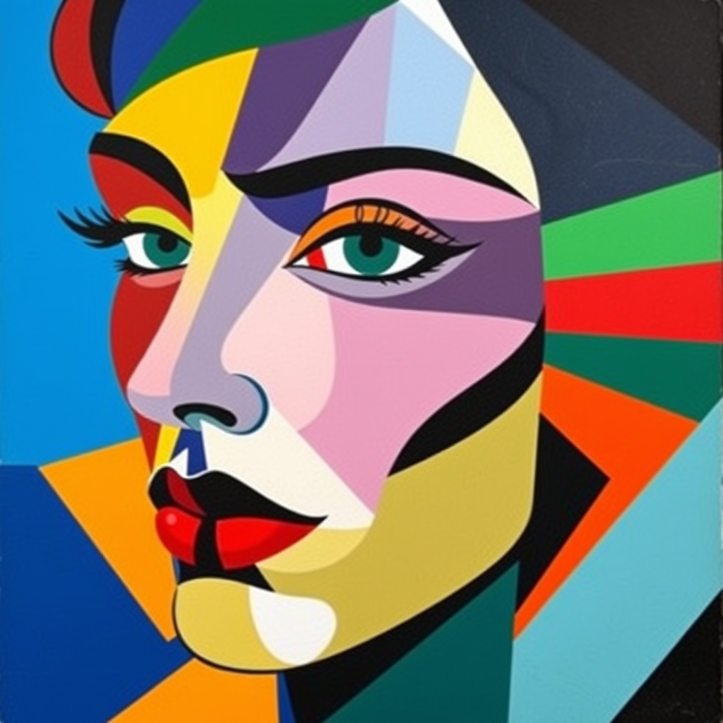 A vibrant cubist portrait of a woman's face inspired by Pablo Picasso, showcasing bold geometric shapes and striking colors, capturing the essence of modern artistry with a dynamic interplay of perspectives and a harmonious blend of abstract features.