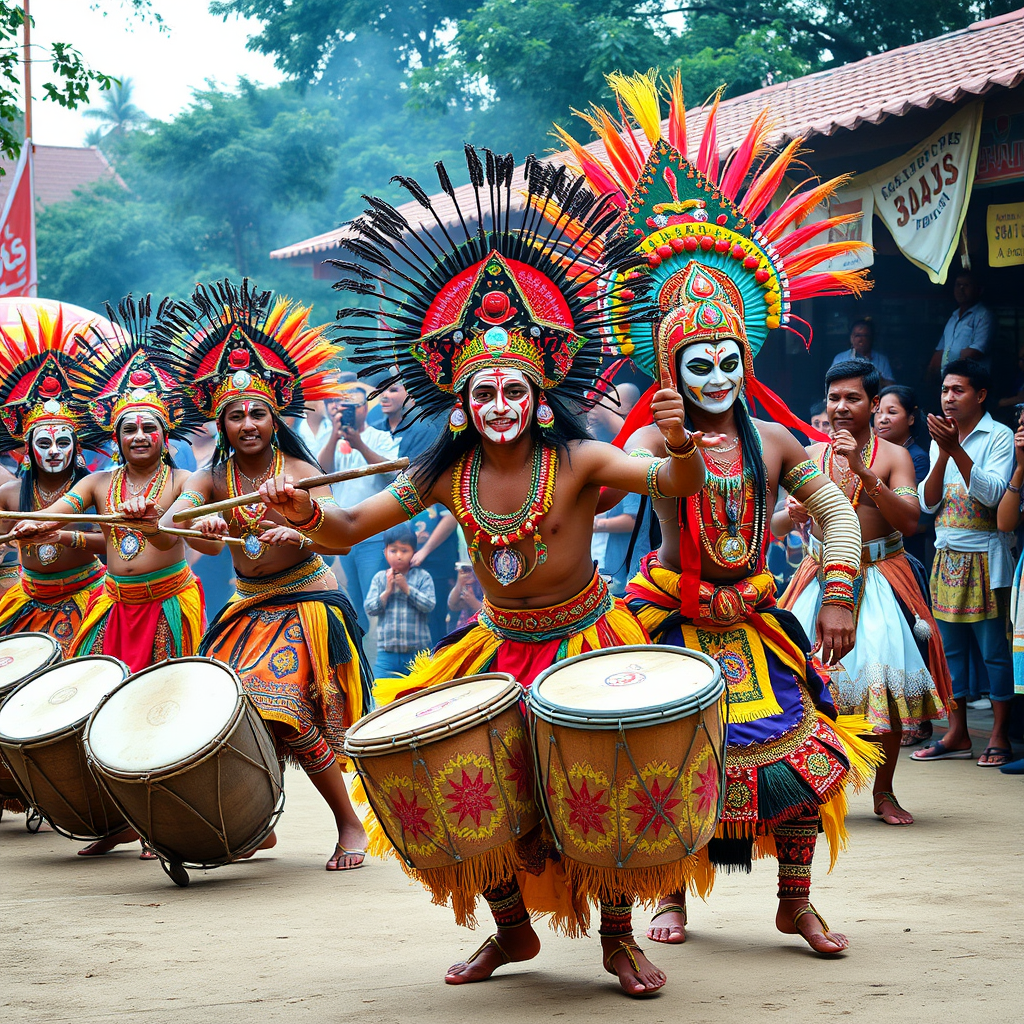 A vibrant cultural ritual where skilled performers in elaborate, colorful costumes and intricate face paint dance rhythmically to the beat of traditional drums, embodying ancient deities and stories, creating a mesmerizing fusion of art, spirituality, and community reverence.