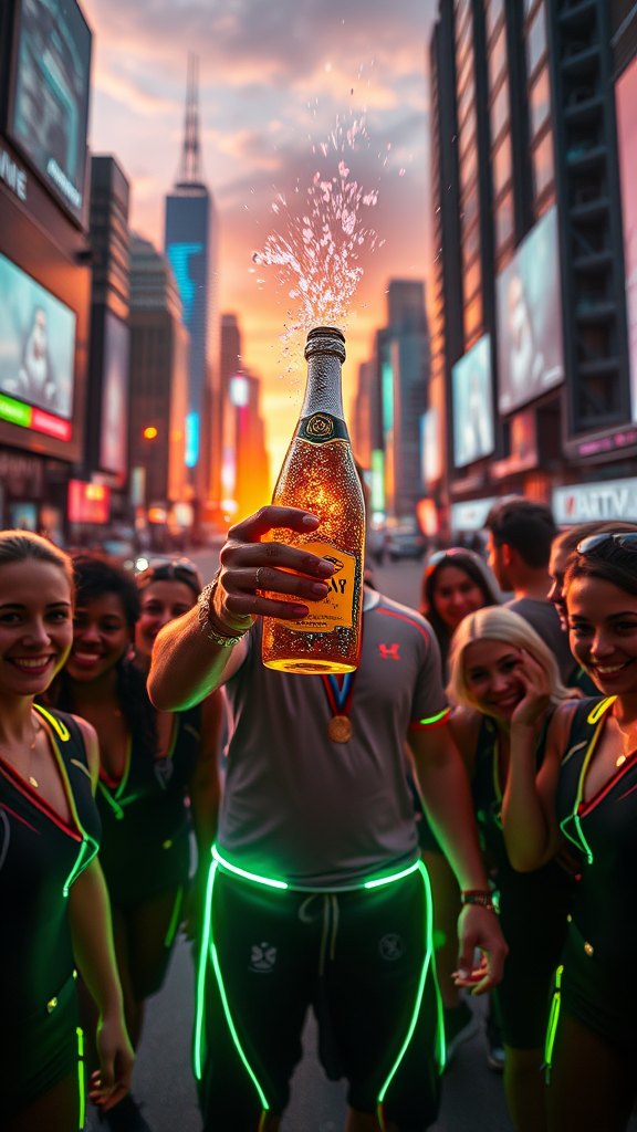 A vibrant cyberpunk cityscape buzzes with neon lights in the background as the summer sun dips below the horizon. The medal-winning athlete stands triumphantly in the midst of a diverse group of friends and teammates, their futuristic attire glowing with LED trims. In his hands is a sleek, translucent bottle of sparkling nanotech-infused champagne, shooting iridescent foam that glimmers with holographic hues in all directions. The faces around him are illuminated with joy, their cybernetic enhancements subtly reflecting the celebratory mood. The aerial camera captures the scene from the front and slightly above, encapsulating an atmosphere of electric ecstasy and camaraderie under the sprawling digital billboards that adorn the towering skyscrapers.