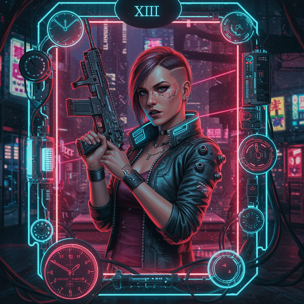 A vibrant cyberpunk scene featuring a woman in a captivating portrait, holding a futuristic gun. She is surrounded by an intricate tarot card frame made of neon-lit, cyberpunk-style clocks and equipment. The atmosphere is infused with lasers and glowing elements, capturing the essence of a sci-fi world reminiscent of Cyberpunk 2077. Her expression is fierce and focused, enhanced by the chiaroscuro lighting that emphasizes the detailed craftsmanship of her cyberpunk attire and accessories. The backdrop is a stunning high-definition display of cybernetic cityscapes, rich with vibrant colors and cinematic flair, reminiscent of an anime key visual. This masterpiece is meticulously detailed and exudes a sense of breathtaking artistry, embodying both the raw energy and refined quality of a futuristic vision.