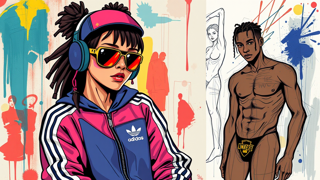 A vibrant depiction inspired by Jean Michel Basquiat captures a cyborg girl in a dynamic Adidas tracksuit, exuding a sporty and affluent presence reminiscent of the 80s. The scene melds vintage photography aesthetics with a playful cartoonish touch, juxtaposed against abstract elements. Nearby, a stylized naked Black man evokes the boldness of Manet’s artistry, blending into the eclectic mix. The overall image dances between sketch-like outlines and intentional chaotic brushstrokes, embracing an intentional rawness and imperfect quality that challenges traditional boundaries.