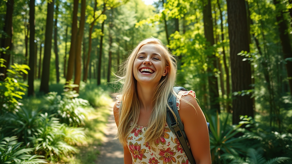 A vibrant depiction of a blonde social media influencer enjoying a serene hike through lush forest trails on a bright, warm day, her laughter echoing amidst the towering trees, sunlight dancing through the leaves casting playful shadows on her face, her camera capturing moments of nature's beauty intertwined with her relaxed, joyful energy.