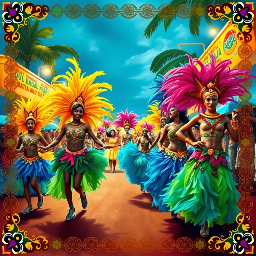 A vibrant depiction of a Brazilian carnival celebration featuring dancers in colorful, feathered costumes set against a lively background with intricate borders inspired by traditional Brazilian patterns; the scene captures the energy and spirit of the festivities with samba dancers, vibrant floats, and musical instruments, all in an elongated 9:16 aspect ratio, reflecting the joyous atmosphere with vivid colors and dynamic movement.