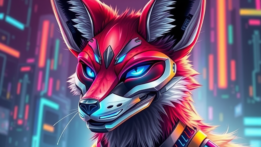 A vibrant depiction of a cybernetic fox with sleek, metallic fur and glowing blue eyes, donning a futuristic, streamlined mask over its muzzle, set against a backdrop of a neon-lit digital landscape.
