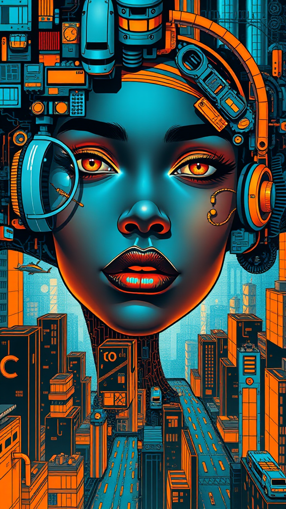 A vibrant depiction of a female face in the essence of Afrofuturism, merging the artistic influences of George Callaghan with themes of engineering and architectural design. This artwork captures elements of bustling urban life, rendered in striking dark cyan and bold orange hues. The poster art style gives a dynamic flair, presenting an intricate interplay of futuristic cityscapes and modern technological motifs, all in ultra-high definition, elongated with an aspect ratio of 1:2, showcasing a creative blend of bold abstraction and stylized realism.