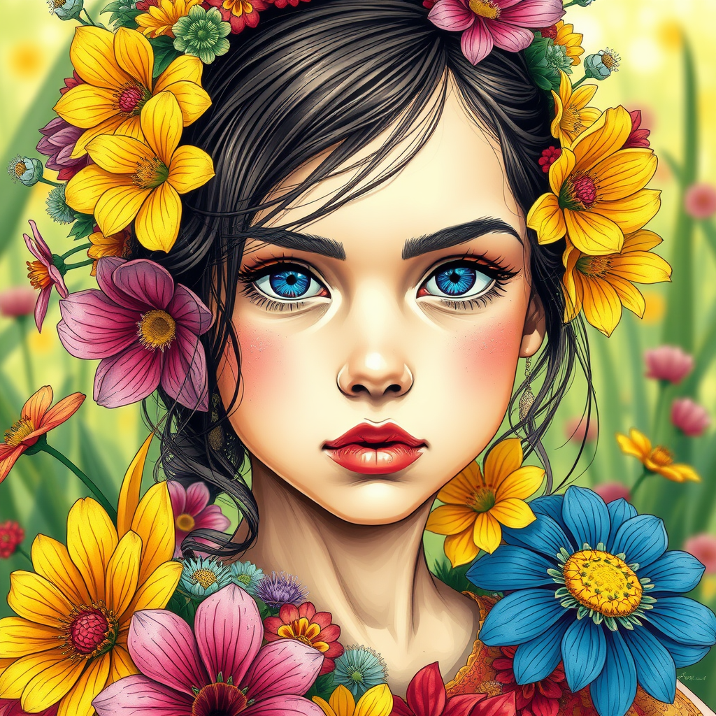 A vibrant depiction of a girl adorned in an array of colorful flowers, crafted in the style of Artgerm with expressive linework. Her features are exquisitely detailed, capturing the essence of cottagecore with nature-inspired elements. The close-up view highlights her intense expression and the lush intricacies of her floral attire, blending harmony with the natural backdrop.