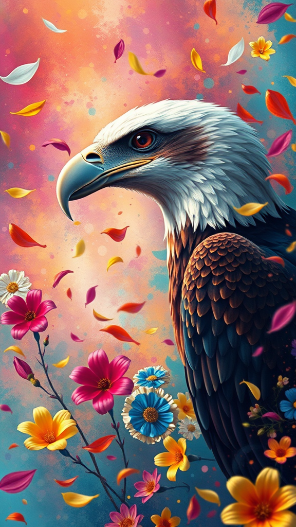 A vibrant depiction of a majestic eagle captured in profile, its elongated beak prominent and face sharply in focus. Surrounding the eagle is an abstract fantasy background, awash in a kaleidoscope of colors. Flower petals, vivid and varied, dance in the wind, creating a dynamic, ethereal atmosphere. The scene is infused with a sense of movement and whimsy, blending the surreal with the natural.