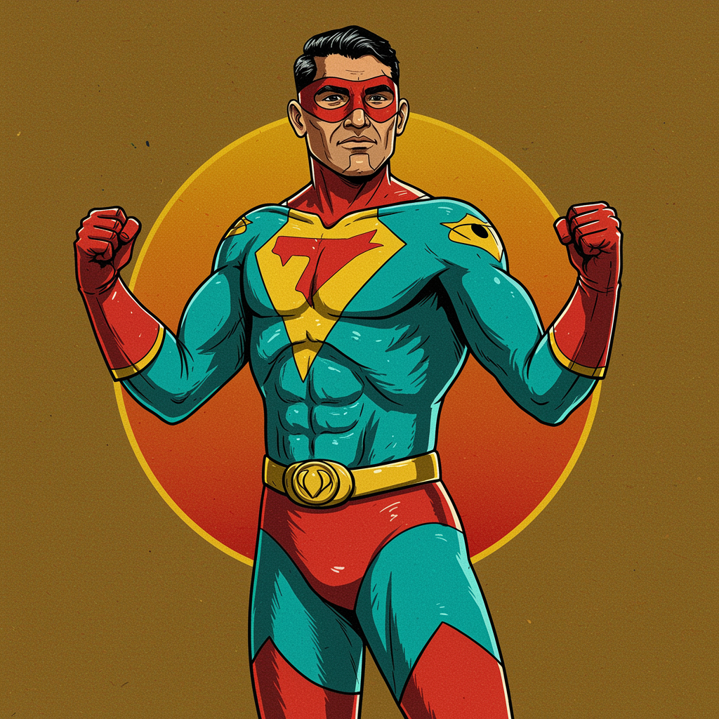 A vibrant depiction of a man donning a superhero costume, his fists clenched in empowerment, arms strong and dynamic. The style is reminiscent of chicano art, rich with cultural motifs. The color palette features deep dark yellow and vivid turquoise, accentuated with fiery red and lustrous bronze. The composition is akin to bold, eye-catching posters, infused with the spirit of rangercore. The visual texture evokes the classic essence of an argus c3 camera and the avant-garde flair of the blue rider movement. A blend of tradition and modernity, capturing strength and resilience in every detail.