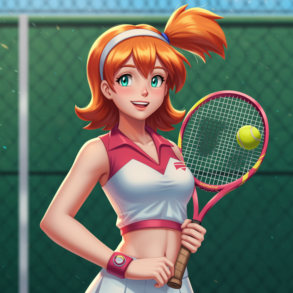 A vibrant depiction of a woman with a confident expression in a classic tennis uniform, her retro tennis racket held casually yet poised. Her hairstyle reminiscent of Misty from Pokémon, adding a playful charm. She exudes the nostalgic charm of 80s and 90s anime, her features capturing the essence of both decades' art styles with a touch of realism bringing her to life. The setting has a subtle retro ambiance, enhanced with soft pastels and dynamic lines that define the iconic era of anime. Her eyes sparkle with determination, set against a backdrop of gentle gradients and nostalgic hues. The essence of realistic 3D animation breathes additional depth into her classic anime aesthetic.