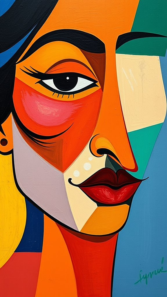 A vibrant depiction of a woman's face in the style of Pablo Picasso's cubism, featuring bold and vivid colors, with an abstract composition and a touch of fluidity, exploring geometric shapes juxtaposed with organic curves, all harmonized in a balanced 1:1 aspect ratio.