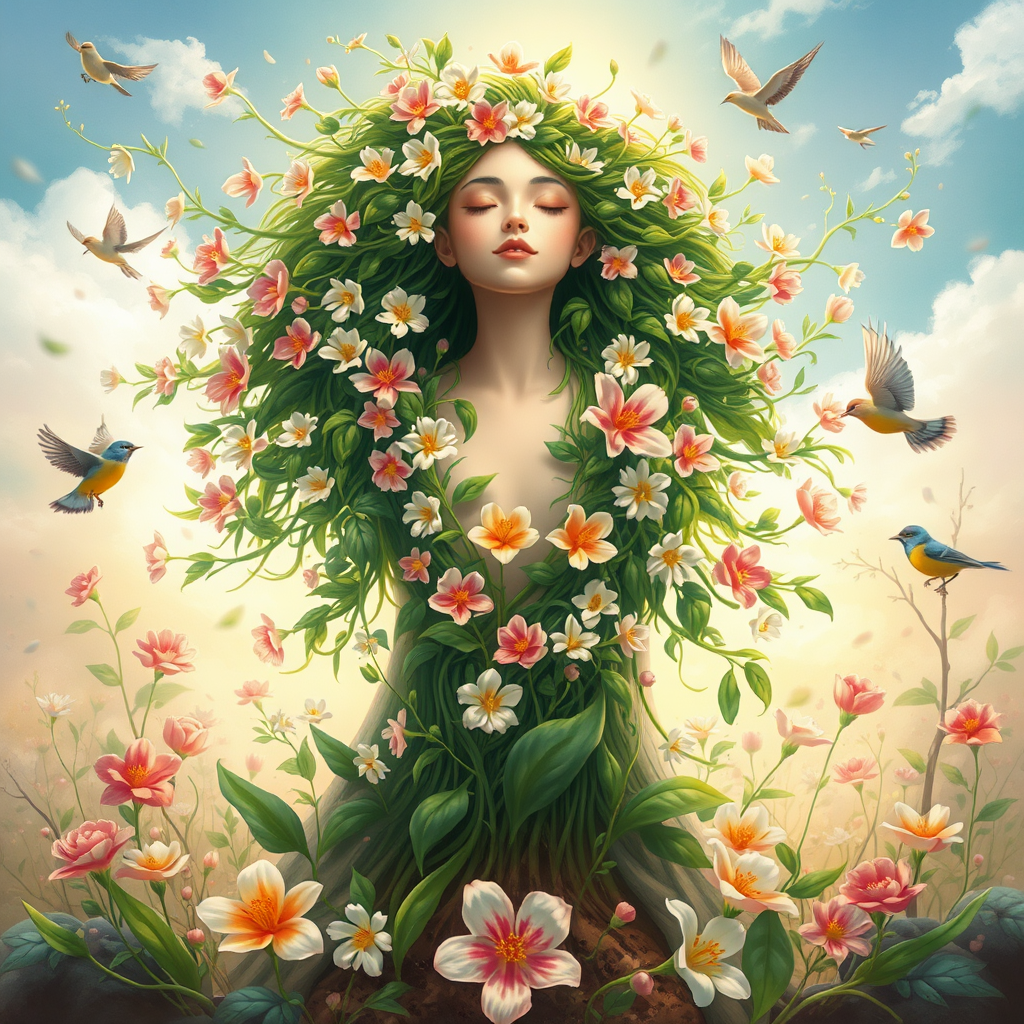 A vibrant depiction of springtime personified, capturing the essence of renewal and growth. Imagine a figure emerging from the earth, adorned in lush greens and blossoming flowers. Their hair flows like gentle streams, interwoven with blooming petals, radiating warmth and vitality. The air around them shimmers with a fresh, invigorating energy, as new leaves unfurl and birds sing in harmonious chorus. This embodiment of springtime exudes a sense of optimism and rejuvenation, painting the scene with a palette of soft pastels and bright hues, evoking the delightful awakening of nature.