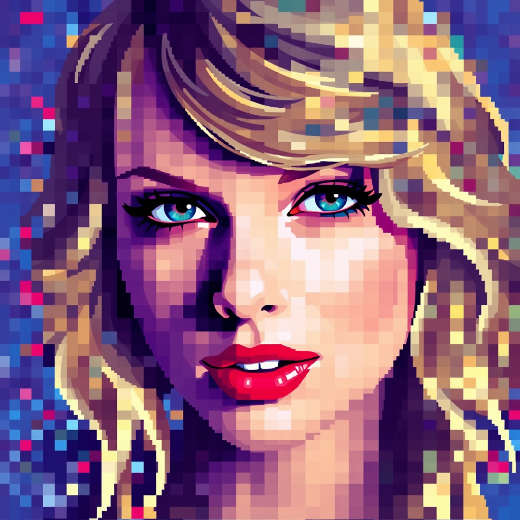 A vibrant depiction of Taylor Swift's visage rendered in a mosaic of colorful pixels, blending shades harmoniously to create an abstract representation that captures her essence.