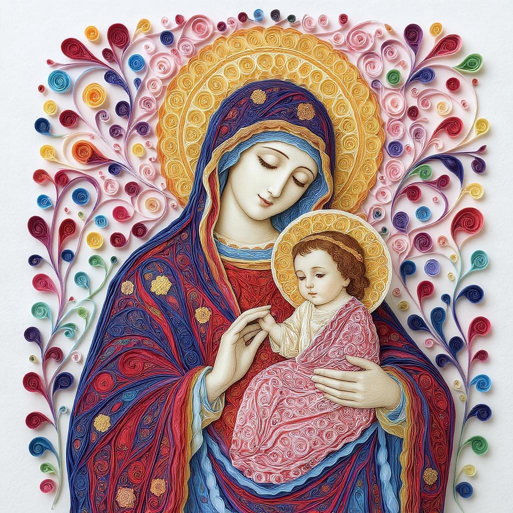 A vibrant depiction of the Virgin Mary cradling baby Jesus in a paper quilling art style, featuring an array of swirling, intricate patterns with an explosion of colors, from rich blues and reds to vivid golds and greens, looking both delicate and dynamic.