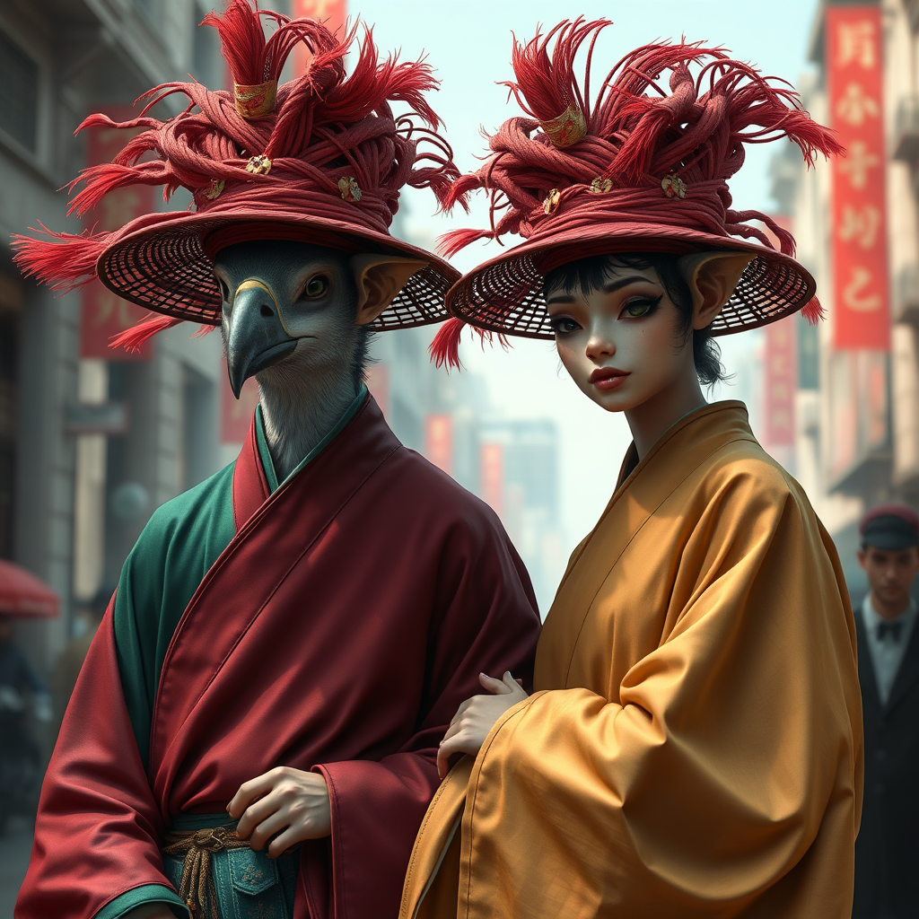 A vibrant depiction of two figures adorned in intricately woven cloth hats and flowing robes, styled akin to realistic animal portraits, yet infused with the innovative flair of Unreal Engine. The composition blends neo-renaissance elements with a rich palette of maroon and emerald hues, weaving an avian-inspired theme into a lively portrayal of city life. The characters, exuding undeniable charm, capture the viewer's imagination with their poised expressions and lively presence amidst an urban landscape, subtly merging classical and contemporary artistic nuances.