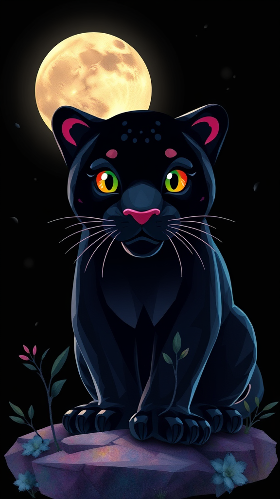 A vibrant design featuring a silhouette of a black panther, its form defined under the glow of a moonlit night. The design is crafted for t-shirt art, combining 3D vector elements with a cute and quirky personality. The scene is set against a deep black background, enhanced with a watercolor effect for a dreamy touch. The artwork embraces low-poly aesthetics with soft lighting, presented from a bird's-eye view in an isometric style, giving it a retro vibe. The panther is central to the piece, its character enlivened by bright, bold, and colorful accents. Rendered photorealistically in 4K resolution using Cinema 4D, the design focuses on the front side of the panther, exuding charm and a hint of mystery.