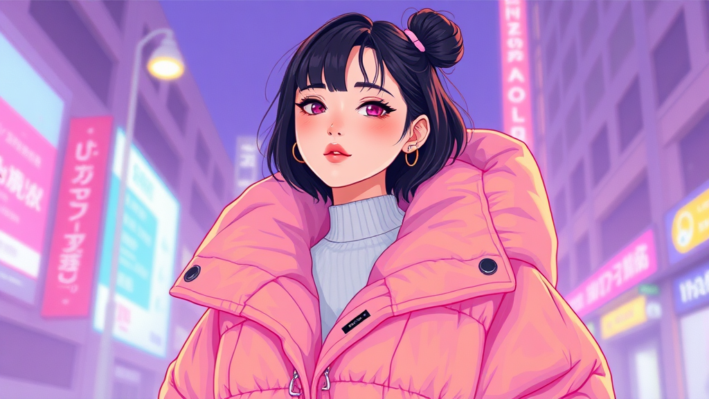 A vibrant digital art illustration featuring a woman in an oversized puffer jacket styled as a poncho, channeling the aesthetic of Off-White and Yanjun Cheng, infused with Tumblr and 'lofi girl' internet meme culture. The artwork trend on Dezeen showcases a catalog photo feel intertwined with 3D render influences from Beeple, Rhads, and Lois van Baarle. The character is depicted in a cartoon style with bright pastel colors, reminiscent of retro anime girls, creating a beautiful and captivating piece.