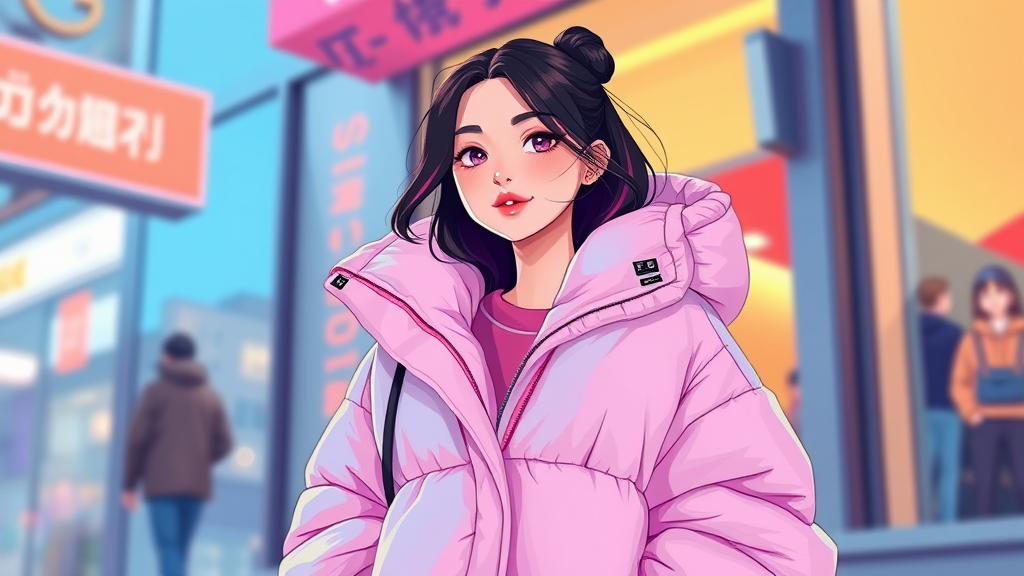 A vibrant digital art piece depicting a 30-year-old woman in an oversized puffer poncho jacket, drawing inspiration from Off-White and Yanjun Cheng's style. The illustration channels the essence of the lofi girl internet meme with tumblr aesthetic, featuring bright pastel colors. The scene is captured in a catalog photo style, reminiscent of trending designs on dezeen, with 3D render influences from artists like Beeple, Rhads, and Lois van Baarle. The artwork embraces a retro anime vibe, characterized by a cartoon style that reflects a playful yet stylish representation of a modern woman.
