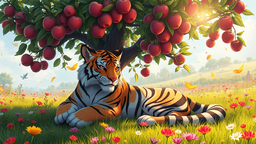 A vibrant digital art piece of a majestic tiger-like Pokémon resting gracefully under a lush apple tree, featuring cartoon-style elements, infused with the enchantment of magic realism. The scene is adorned with an explosion of bright colors, capturing hyper quality and intricate details with the essence of a matte painting. The image is meticulously rendered in high resolution, portraying the serene yet mystical atmosphere. The tiger Pokémon's fur glistens under dappled sunlight filtering through the apple-laden branches, surrounded by an array of wild, colorful flora, and enchanted creatures that add a whimsical charm to the setting. In the distance, a gentle breeze sways the tree, causing a few apples to tumble softly onto the vibrant meadow.