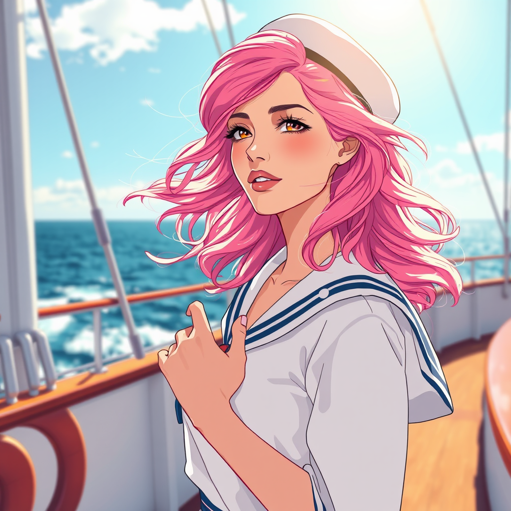 A vibrant digital artwork depicting a female sailor standing on the deck of a ship, relishing the refreshing seabreeze. Her medium wavy pink hair flows gracefully in the wind under the bright sun. The scene, inspired by Terese Nielsen, features an ethereal, volumetric atmosphere with the highest quality detail and sharp focus. She has a beautiful face and elegantly posed hands, captured in 4k UHD for a breathtaking, cinematic experience. The artwork is intricate with precise line art and vivid colors, showcasing an award-winning level of detail. There is no text, watermark, or signature present. Her attire is fitting of a sailor, without any accessories like sunglasses. The composition is flawlessly detailed, avoiding any inconsistencies or poorly rendered features.