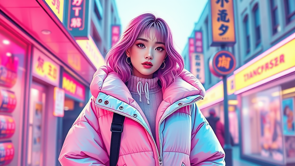A vibrant digital artwork featuring a woman in a poncho oversized puffer jacket, influenced by Off-White aesthetics, with a nod to Tumblr and the style of Yanjun Cheng. The illustration channels the essence of the lofi girl internet meme, gaining traction on design platforms like Dezeen. The scene is a catalog-like photo rendered in 3D, reminiscent of Beeple's techniques combined with the unique touches of Rhads and Lois van Baarle. This piece showcases a retro anime girl vibe with bright pastel tones, delivering a visually striking and beautiful illustration.