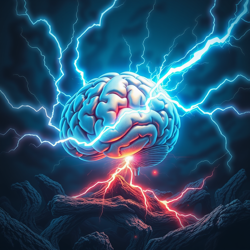 A vibrant digital illustration depicts a glowing brain being struck by a bright neon blue lightning bolt, transforming into a radiant orb of energy. The orb has a metallic sheen, surrounded by swirling streams of electrifying energy that illuminate the dark and mysterious surroundings. Faint shadows dance in the background, enhancing the mystical and otherworldly atmosphere. Intricate details and textures emphasize the fantastical nature of the scene, drawing viewers into an enchanting and otherworldly realm.