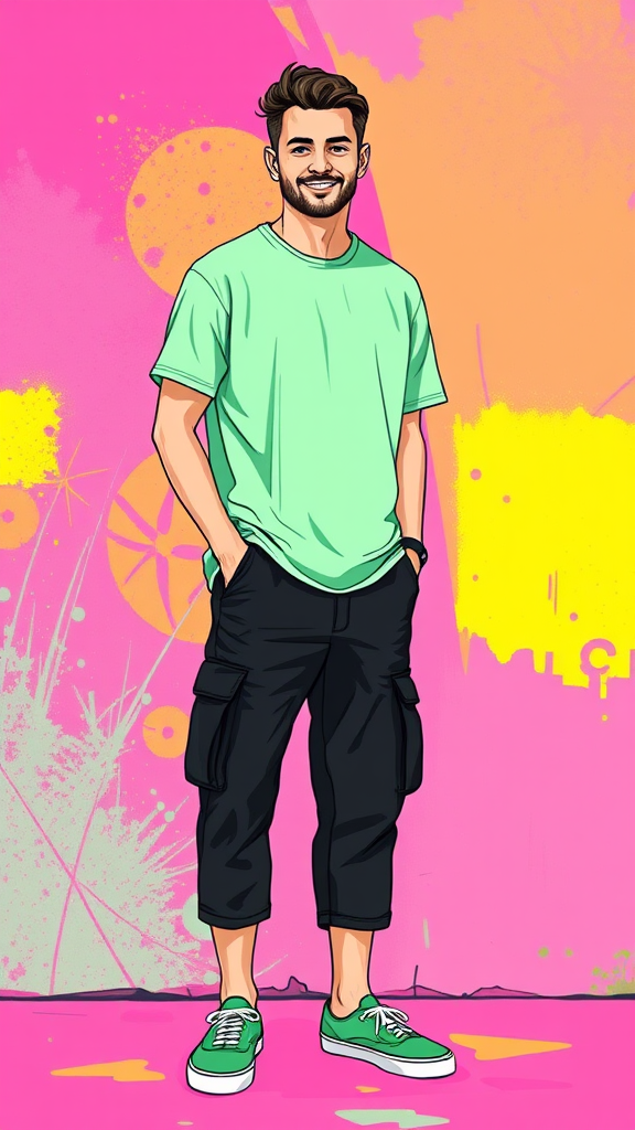 A vibrant digital illustration features a man in a playful, cute cartoonish style, clad in a mint green over-fit T-shirt and black capri cargo pants. His ensemble is completed with green Vans old school sneakers. The artwork showcases bold outlines and pops with bright pink, neon green, and magenta hues. The man stands against a vivid, color-saturated wall that fills the background, creating an energetic and lively scene. His relaxed and casual pose harmoniously integrates with the lively backdrop, evoking a sense of whimsy and fun. Bright and bold colors dominate the piece, contributing to the artwork's dynamic and playful nature.