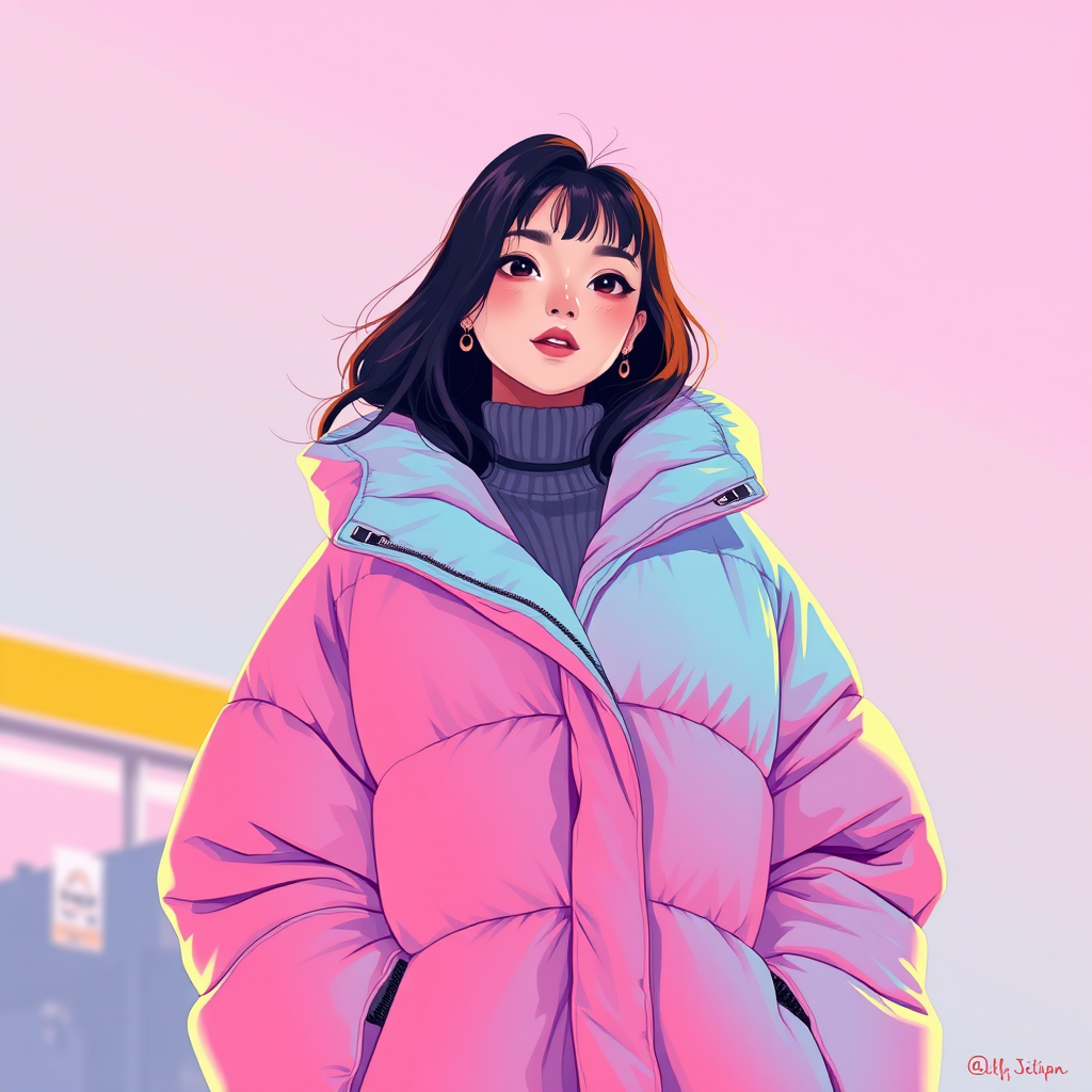 A vibrant digital illustration featuring a woman in an oversized puffer jacket with poncho elements, exuding an Off-White aesthetic. The artwork draws inspiration from Yanjun Cheng and combines the nostalgic feel of a retro anime girl with the lofi girl internet meme aesthetic. Rendered in bright pastel colors, the scene feels like a snapshot from a trendy catalog photo, with nods to artists like Beeple, Rhads, and Lois van Baarle. The style is cartoonish yet sophisticated, with a hint of tumblr-era artistry and a design that could be trending on Dezeen. The atmosphere is playful and stylish, reimagining the lofi vibe in a modern, fashion-forward context.