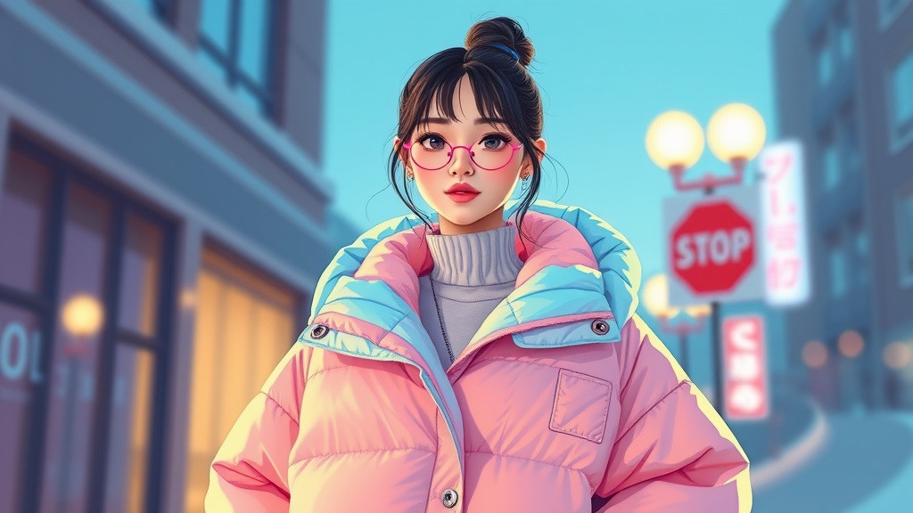 A vibrant digital illustration of a 30-year-old woman wearing an oversized poncho puffer jacket inspired by Off-White and the aesthetic of Tumblr, channeling the style of Yanjun Cheng. The artwork features a character similar to the lofi girl internet meme, trending on Dezeen, and presented as a catalog photo. This 3D-rendered piece is reminiscent of Beeple, Rhads, and Lois van Baarle's works, merging cartoon style with retro anime vibes in bright pastel colors. The creative depiction captures a unique blend of modern fashion and nostalgic elements, showcasing a visually stunning and beautifully crafted scene.