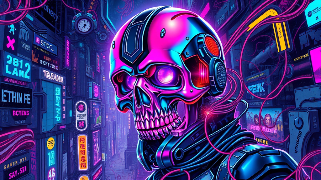 A vibrant digital illustration of a cyberpunk skull encased in intricately detailed armor, teeming with maximalist design elements. The skull features bright, iridescent colors and neon highlights, set against a bustling, futuristic cityscape. The background incorporates chaotic, swirling patterns that enhance the dynamic and electric atmosphere, with intricate circuits and cables weaving throughout the composition, creating a sense of movement and energy. The overall aesthetic blends vivid hues with the sleek, metallic textures of the armor, radiating a sense of rebellion and edgy sophistication.
