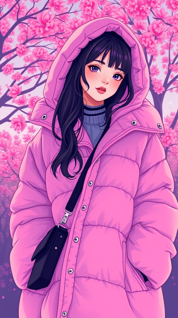 A vibrant digital illustration of a woman draped in an oversized puffer poncho, blending OffWhite's edgy style with a touch of Yanjun Cheng's unique design flair. This artwork, reminiscent of the lofi girl meme and trending on dezeen, captures a retro anime vibe using bright pastel hues. Styled like a catalog photo, it's a 3D-render-inspired piece by Beeple, with the cartoon aesthetics of Rhads and Lois van Baarle. The scene exudes a relaxing, nostalgic atmosphere, creating a beautiful blend of modern fashion and timeless animation charm.