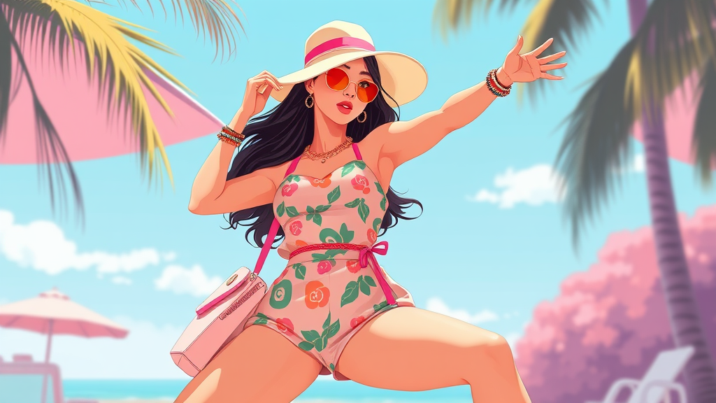 A vibrant digital illustration of a woman striking a dynamic pose in Gucci beachwear, blending the nostalgic charm of retro anime with modern design flair. Her attire features bold patterns and bright pastel colors that catch the eye. The style echoes that of Yanjun Cheng, combining the soothing aesthetic of lofi girl internet meme with the futuristic touch of trending design as seen on Dezeen. The image is a catalog-worthy piece, reminiscent of 3D renderings by Beeple, enriched with the playful yet polished art styles of Rhads and Lois van Baarle. This artwork, with its cartoonish yet sophisticated essence, captures the essence of a contemporary muse, becoming a beautiful masterpiece that resonates with a wide audience.