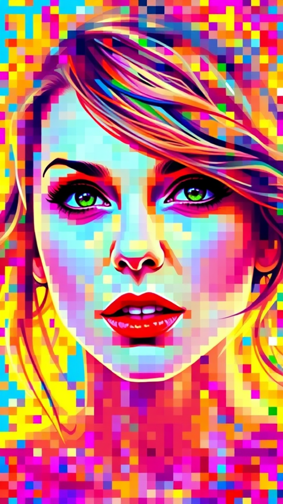 A vibrant digital mosaic portraying Taylor Swift with her features abstracted into a colorful array, capturing the essence of her expression through a spectrum of pixelated hues.