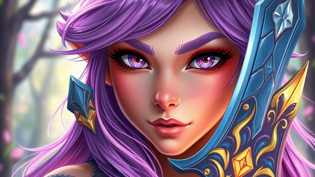 A vibrant digital painting of a close-up portrait of an elf girl with shimmering purple hair and an intricately designed sword, capturing her ethereal and mystical essence. The piece features stunning character art inspired by styles akin to rossdraws, blending dynamic and colorful cartoon elements with the elegance of Artgerm and the boldness of Beeple, resulting in a dazzling portrayal of fantasy with a modern twist. The elf's eyes sparkle with intensity and intelligence, framed by her luminescent hair, set against a softly blurred magical forest background.