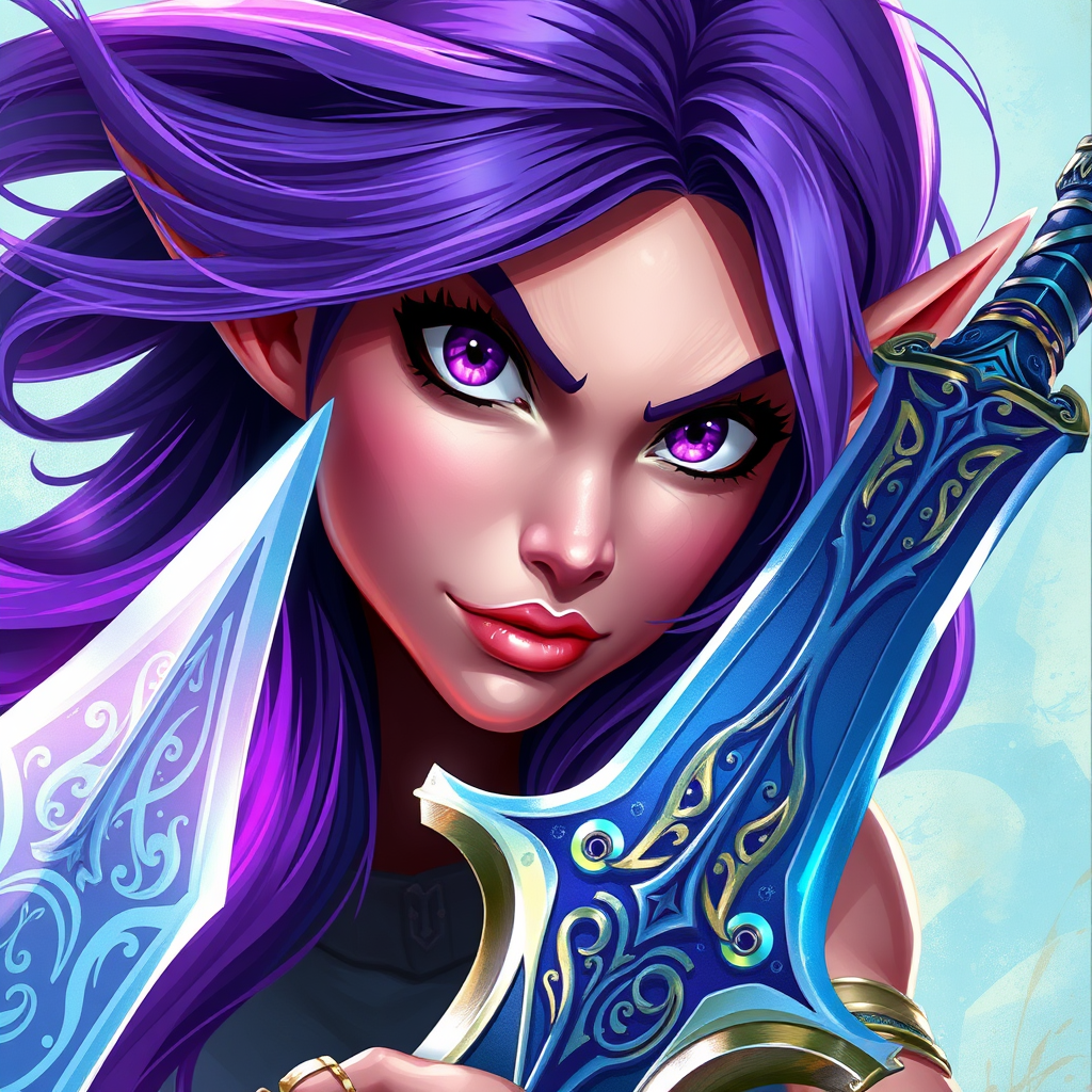 A vibrant digital painting of a close-up portrait of an elf girl with flowing purple hair, holding a shimmering sword with intricate designs. The character's expression is fierce and determined, reminiscent of styles seen in rossdraws and wlop artwork. The art features striking colors and dynamic lighting, blending elements of cartoon vibrancy with realistic textures. The composition captures a sense of motion and elegance, with influences from art styles of Artgerm, Julie Bell, and Beeple, resulting in stunning character art with a modern, captivating feel.