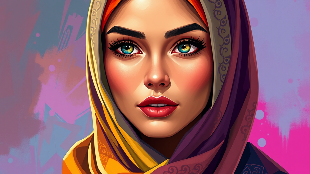 A vibrant digital painting of a woman with a flowing headscarf, her expression serene and captivating. The style blends the smooth brushwork and luminous colors of RossDraws with the graceful lines of ArtGerm and the soft, emotive touch of Atey Ghailan. The composition captures the elegance of Lois van Baarle, with a dynamic yet harmonious balance of vibrant hues in the background. The woman's eyes are expressive and bright, reminiscent of RossDraws 2.5, giving the portrait a cartoon-like vivacity without losing its realistic essence. The headscarf is detailed with intricate patterns, reflecting a fusion of contemporary digital art styles and classical portraiture techniques.