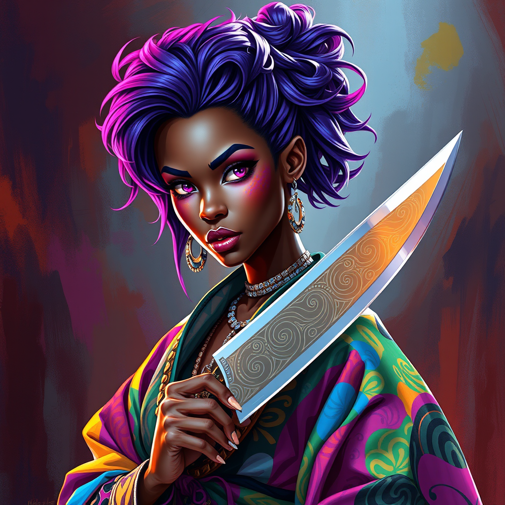 A vibrant digital painting of an Arafed woman with striking purple hair and a kaleidoscopic outfit, holding a gleaming knife with intricate patterns. The artwork exudes Afrofuturism, blending hyper-realistic and cartoon styles with Rossdraws-inspired vibrant colors. Her attire is a fusion of modern and traditional elements, bursting with rich hues and pastels, creating a sense of movement and energy. The background is an abstract blend of dark and vibrant tones, enhancing the depth and allure of the scene. Her expression is both fierce and enigmatic, capturing a sense of power and grace in this stunning piece of digital art.