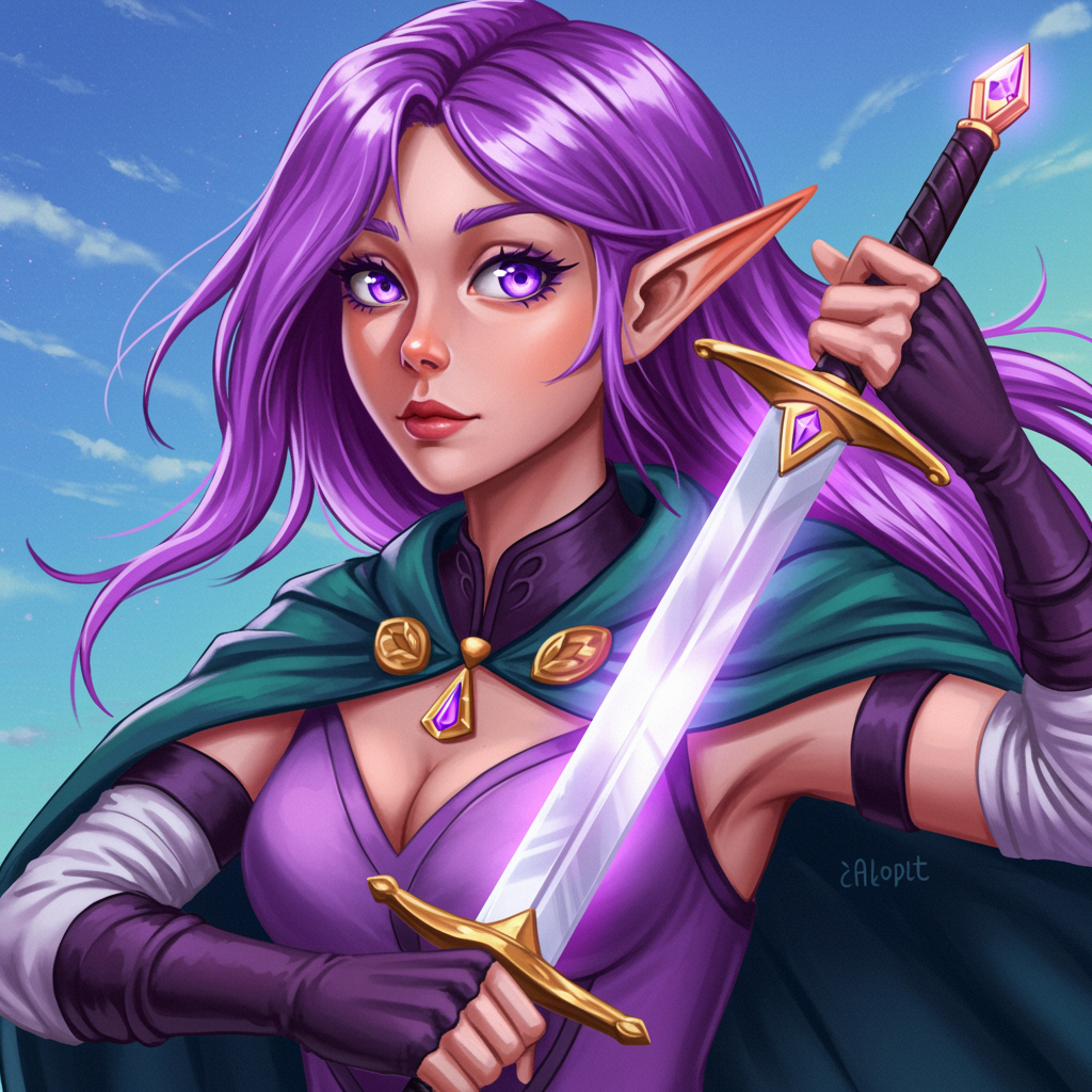 A vibrant digital portrait of a captivating elf girl with flowing purple hair and a gleaming sword, inspired by the styles of rossdraws and WLOP. She possesses an ethereal beauty, her bright eyes reflecting the light with a hint of mystery. Her intricate elven attire glistens with subtle magical elements. The painting captures a stunning combination of vibrant colors and delicate details, blending the dynamic energy of rossdraws with the elegance of Artgerm and Beeple, resulting in a strikingly unique and enchanting character.
