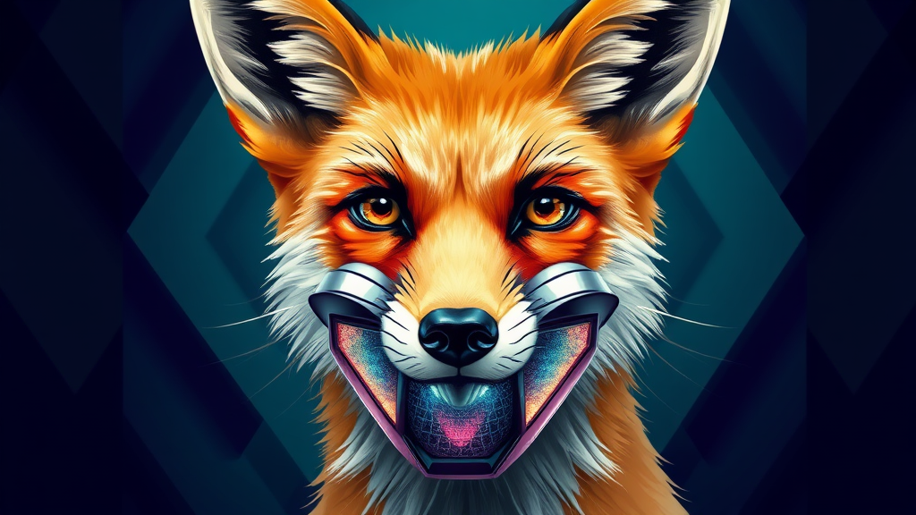 A vibrant digital portrait of a cunning fox with glistening fur in hues of fiery orange and rich cream, wearing a sleek, futuristic mask over its mouth that shimmers with holographic patterns, its sharp eyes sparkling with intelligence and curiosity against a backdrop of abstract geometric shapes and a palette of deep blues and emerald greens.
