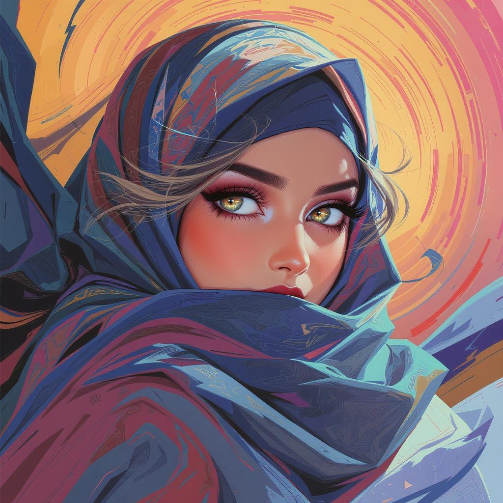 A vibrant digital portrait of a woman with a flowing headscarf that blends into an abstract dreamscape, capturing the vivid and captivating style reminiscent of Rossdraws and Artgerm. Her eyes, full of depth and emotion, are emphasized with the striking, colorful techniques inspired by Lois van Baarle. The dynamic composition showcases a fusion of rich hues, with light and shadows playing across her face, conveying a sense of mystique and allure. The background swirls with vibrant colors, enhancing the ethereal and dynamic essence of the scene, akin to the innovative styles of Atey Ghailan. This artwork embodies a harmonious blend of cartoonish vibrancy and intricate realism, an homage to the evolution of Rossdraws from version 1.0 to 2.5.