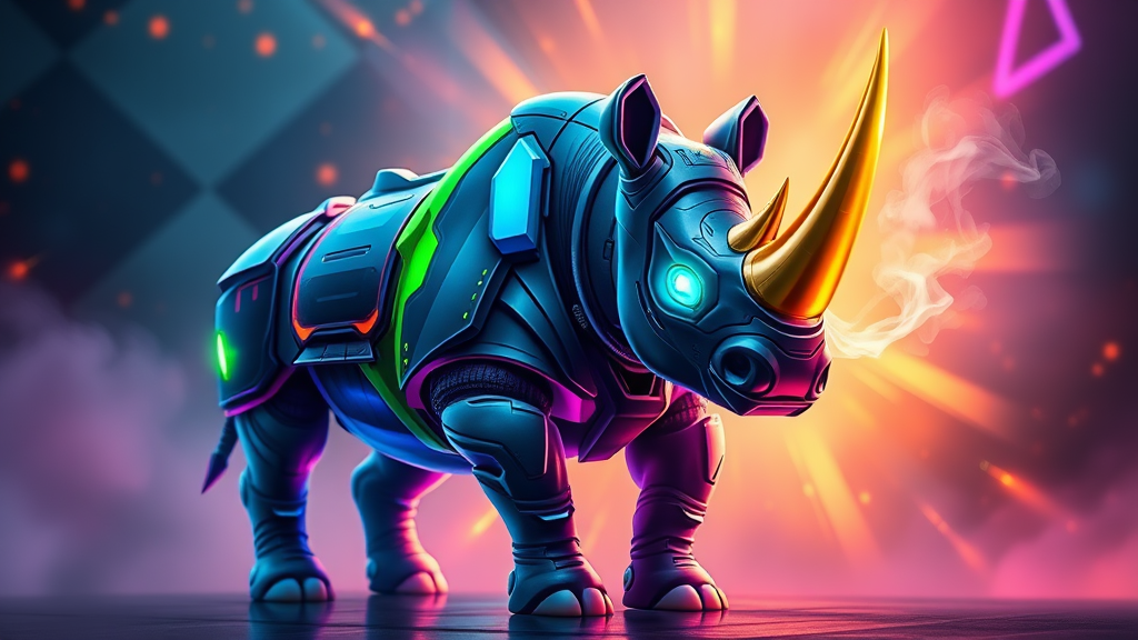 A vibrant digital rhino with luminescent eyes and a radiant golden horn standing majestically, its electronic armor reflecting an esports aesthetic as wisps of digital smoke drift from its nostrils, set against a dynamic, futuristic backdrop of neon colors and electric patterns.