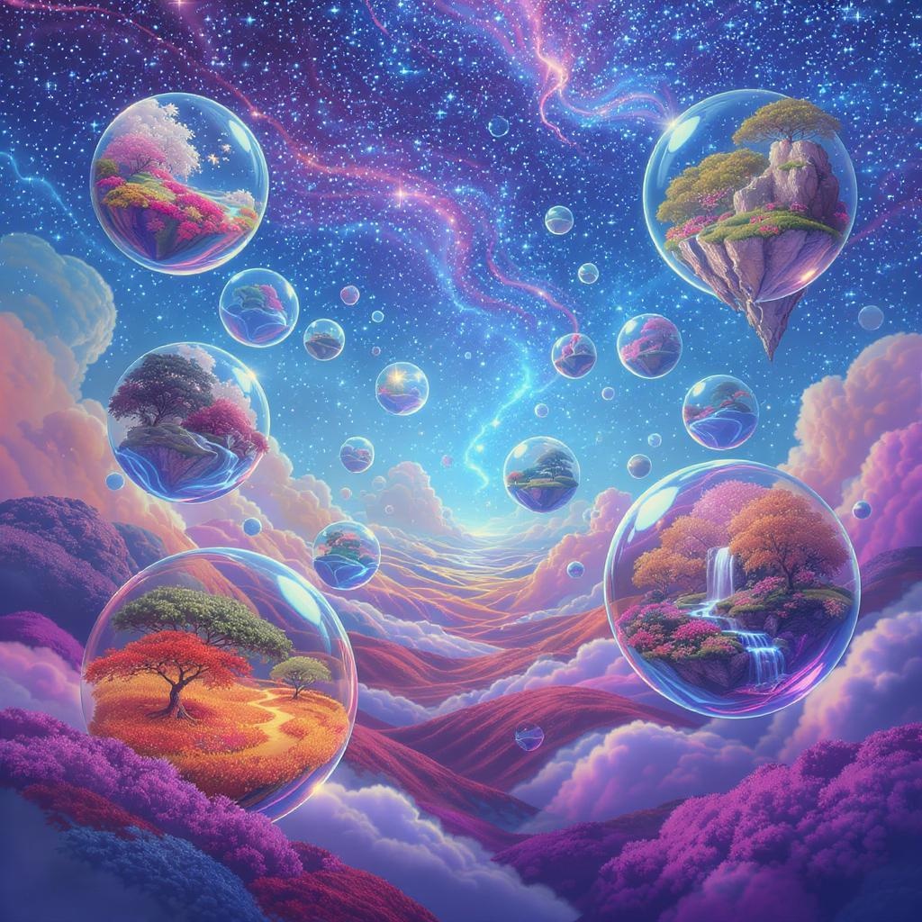 A vibrant dimensional realm where spherical habitats float amidst a kaleidoscopic sky, each bubble reflecting its own unique chromatic ecosystem, with vivid landscapes and color-dwelling creatures thriving in harmony.